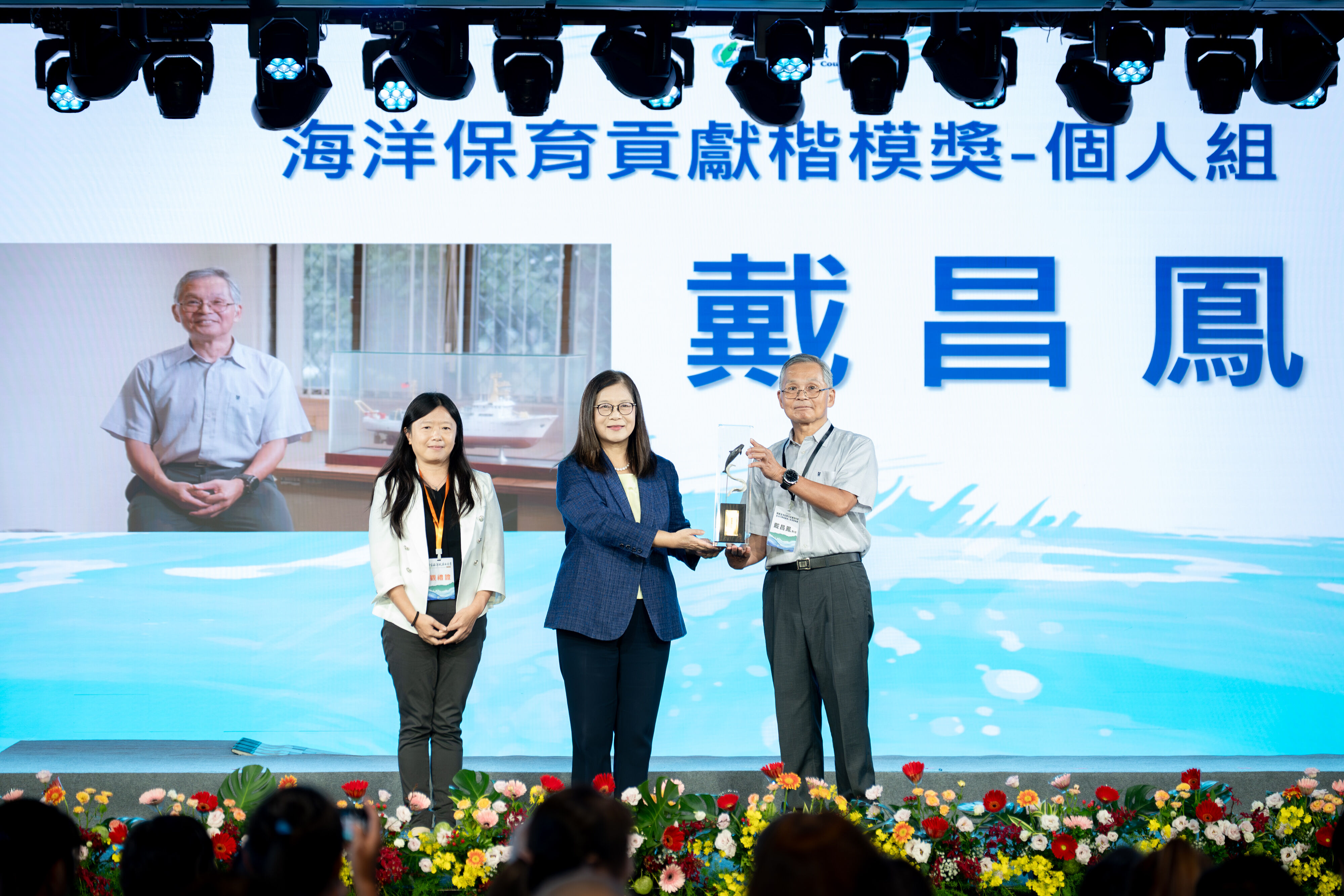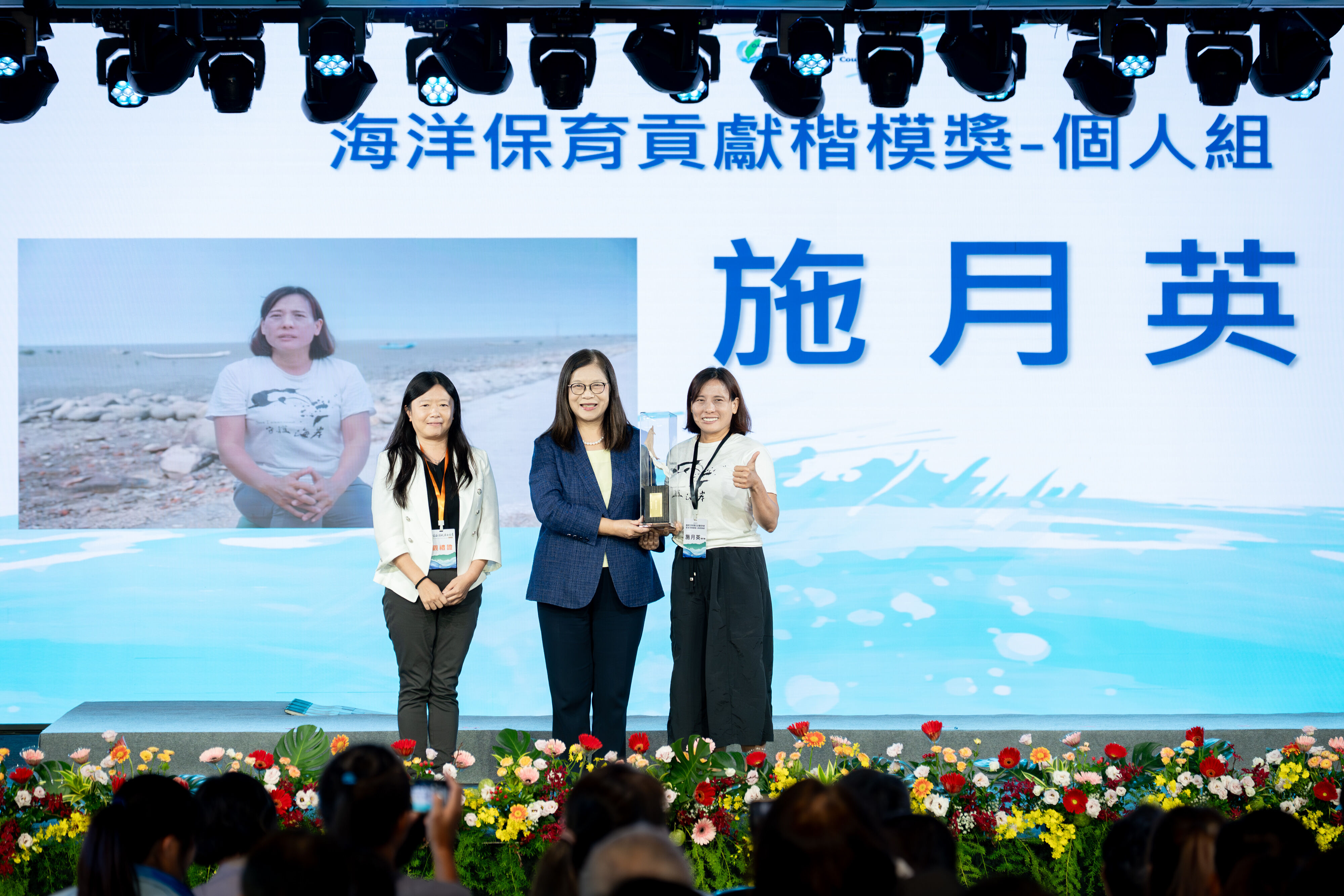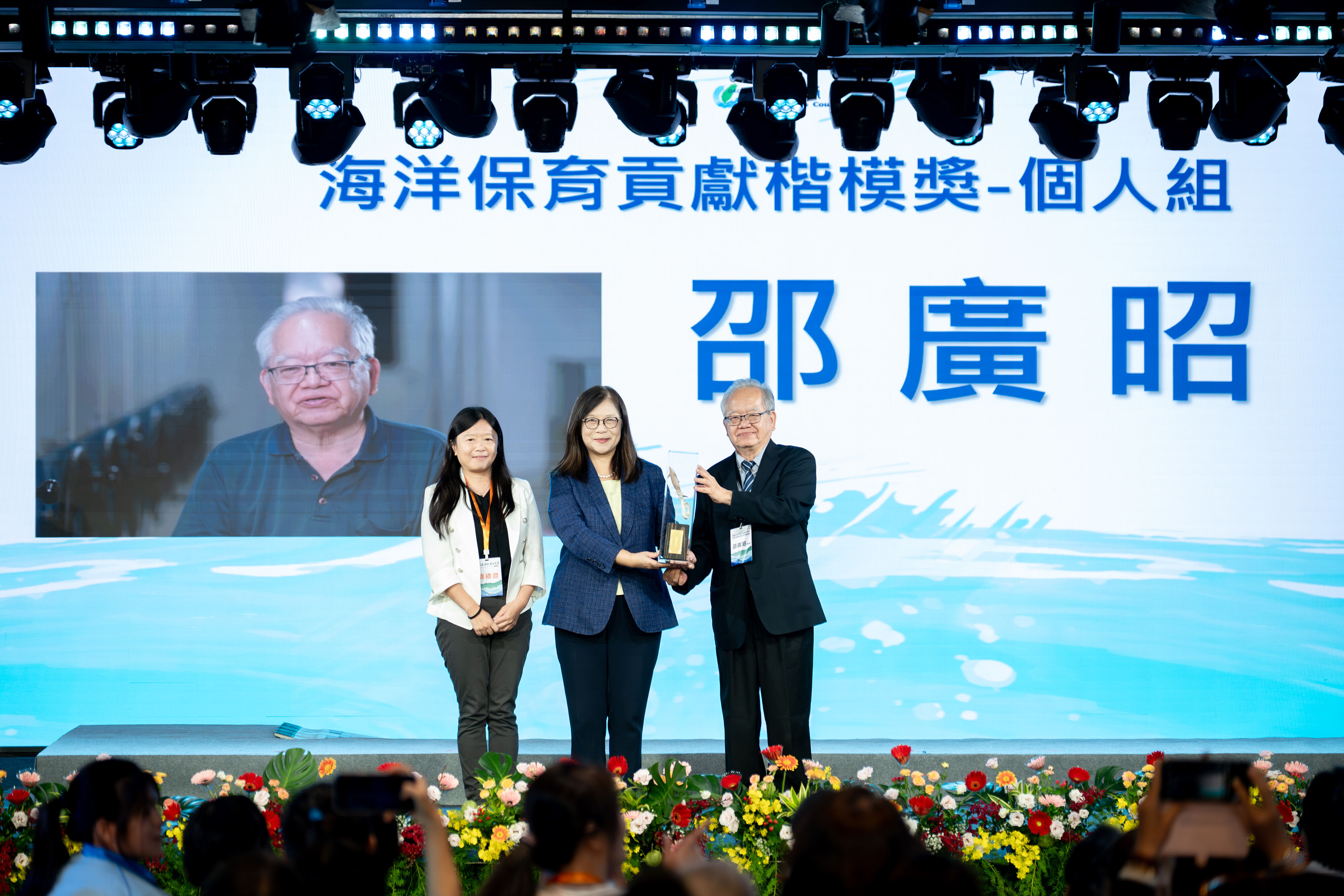陸曉筠進一步指出,5名獲獎的個人組,他們透過專業知識與實務經驗,長期投入海洋保育的領域,像是中央研究院生物多樣性研究中心邵廣昭榮退研究員,畢生致力於台灣魚類分類與生態調查,不僅命名超過60種世界新種,更建立「台灣魚類資料庫」,奠定台灣在國際海洋學術的關鍵地位,他提到面臨海洋資源枯竭,大家應該付出海洋保育行動,努力重現兒時湛藍的回憶。國立臺灣大學海洋研究所戴昌鳳教授,深耕珊瑚研究、復育與科普教育逾三十年,他提到珊瑚白化是氣候危機的警訊,希望全民共同守護健康珊瑚礁之美。國立中山大學海洋事務研究所張懿教授,推動社區參與海洋保護區治理,協助澎湖七美、宜蘭頭城等在地團體強化保護區管理成效,更長期投入三棘鱟的保育工作。社團法人彰化縣環境保護聯盟施月英總幹事,長期關注海洋環境議題,積極監督高污染開發,是海洋保育堅實的在地力量。點點塑環保科技股份有限公司洪以柔執行長,從自身做起,一點一滴實踐減塑行動、海廢循環再生,重現清澈純藍的海洋。