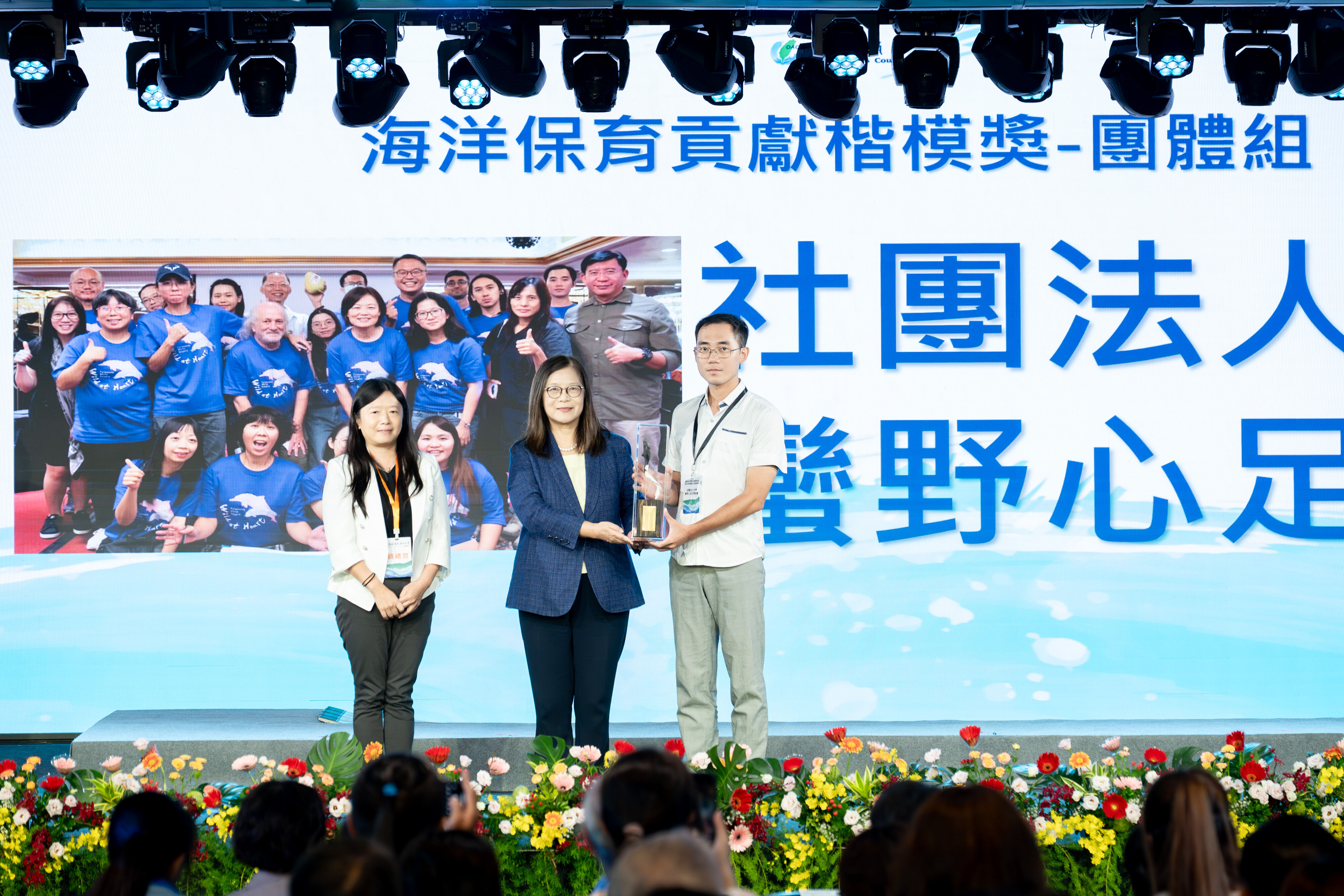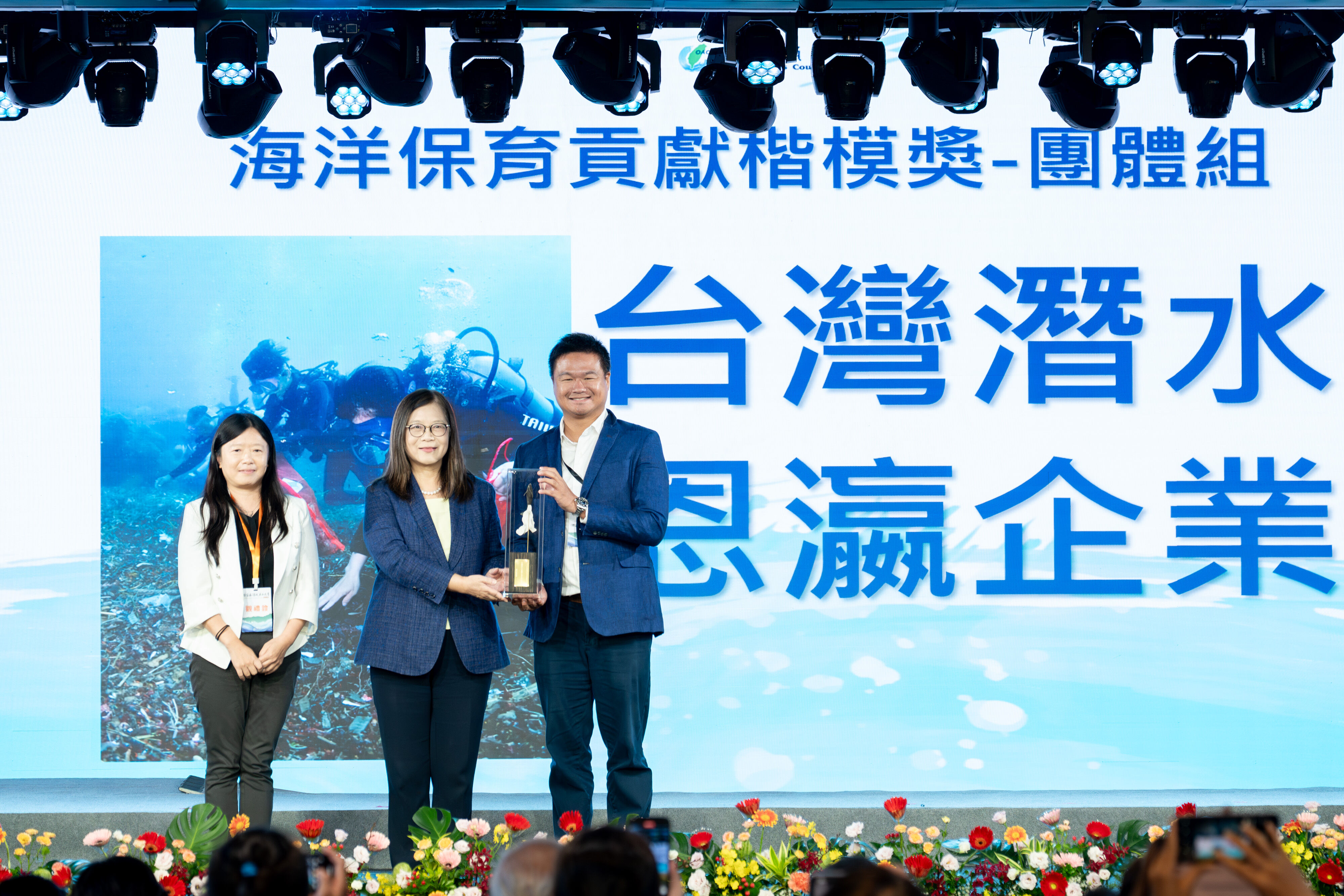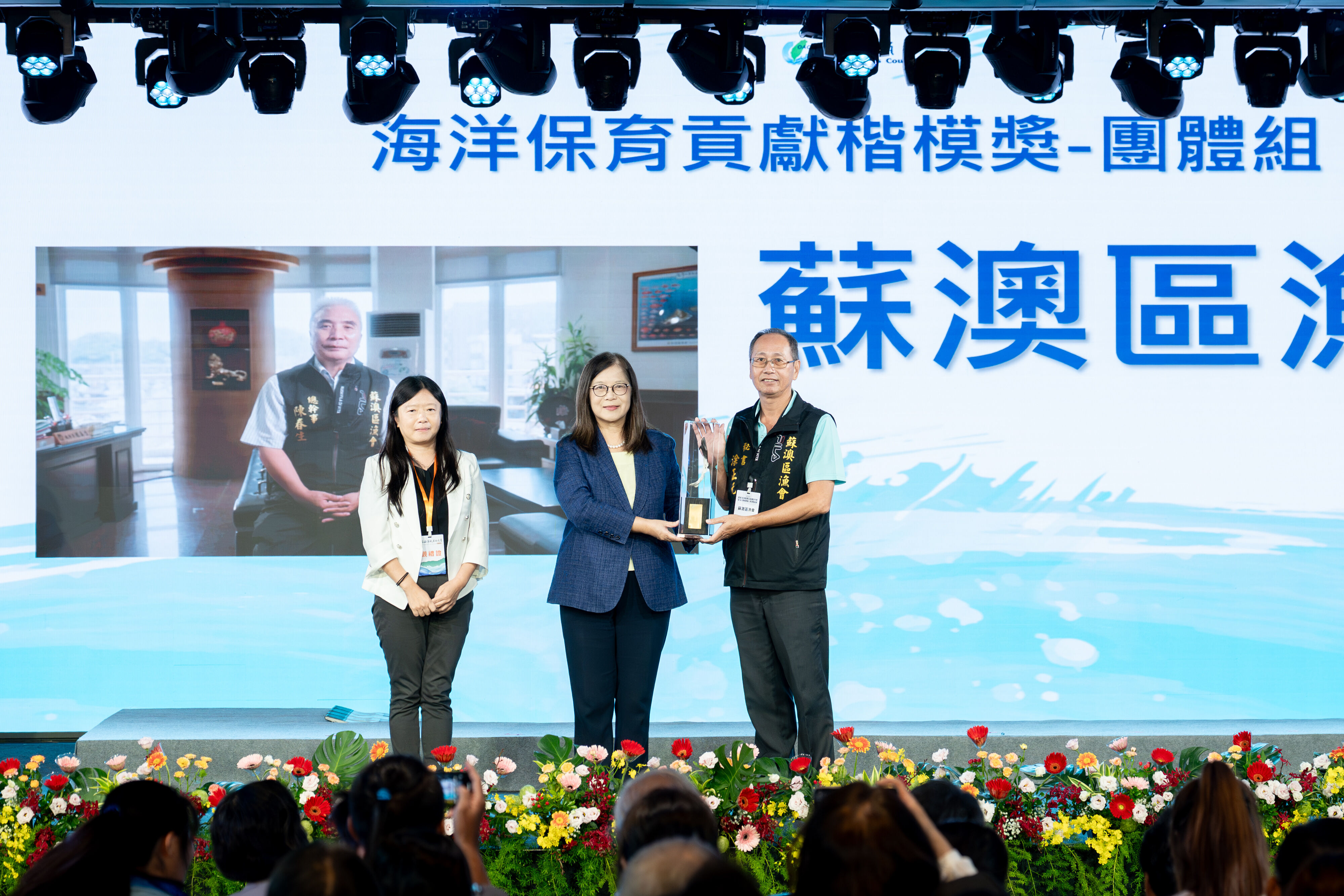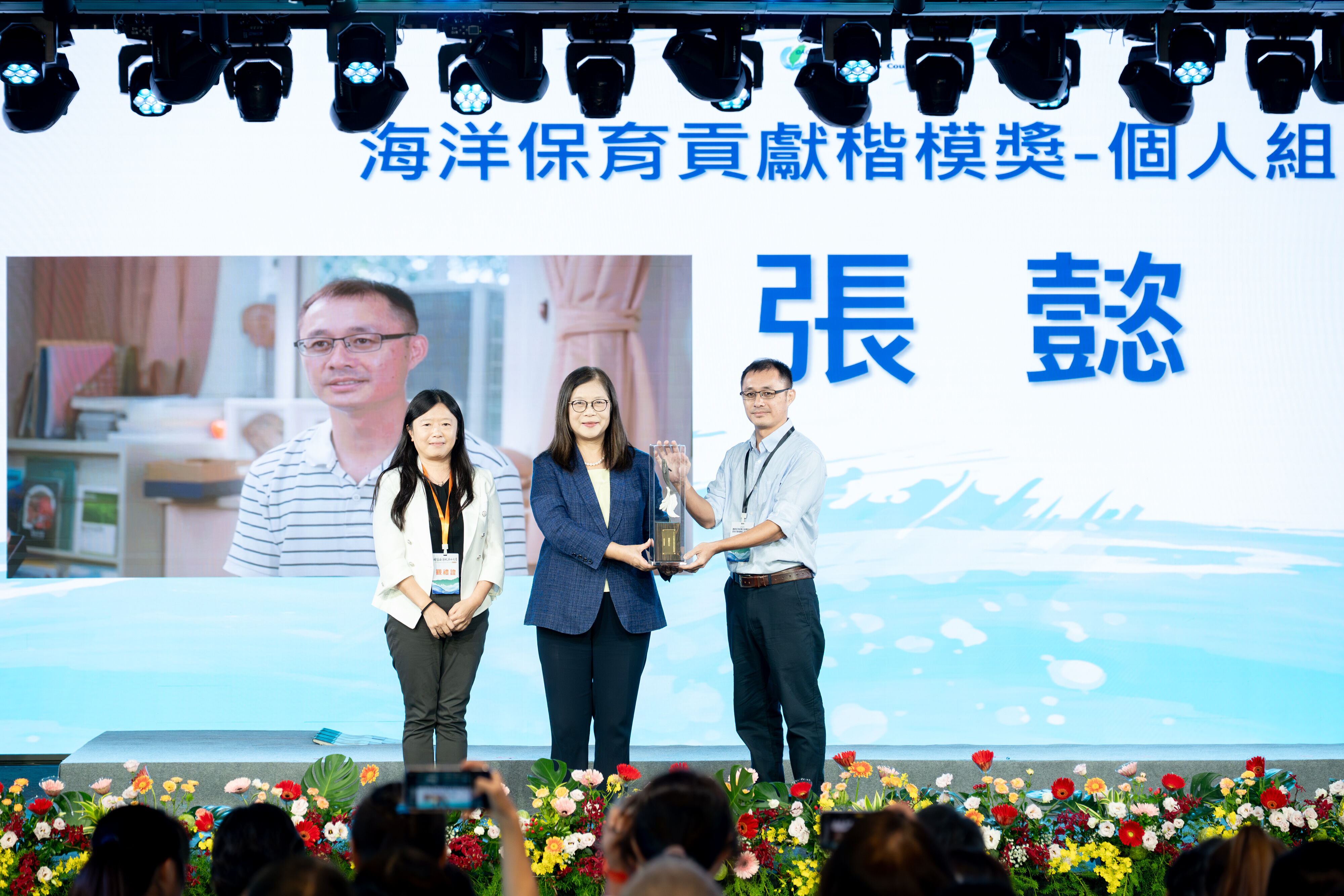 陸曉筠進一步指出,5名獲獎的個人組,他們透過專業知識與實務經驗,長期投入海洋保育的領域,像是中央研究院生物多樣性研究中心邵廣昭榮退研究員,畢生致力於台灣魚類分類與生態調查,不僅命名超過60種世界新種,更建立「台灣魚類資料庫」,奠定台灣在國際海洋學術的關鍵地位,他提到面臨海洋資源枯竭,大家應該付出海洋保育行動,努力重現兒時湛藍的回憶。國立臺灣大學海洋研究所戴昌鳳教授,深耕珊瑚研究、復育與科普教育逾三十年,他提到珊瑚白化是氣候危機的警訊,希望全民共同守護健康珊瑚礁之美。國立中山大學海洋事務研究所張懿教授,推動社區參與海洋保護區治理,協助澎湖七美、宜蘭頭城等在地團體強化保護區管理成效,更長期投入三棘鱟的保育工作。社團法人彰化縣環境保護聯盟施月英總幹事,長期關注海洋環境議題,積極監督高污染開發,是海洋保育堅實的在地力量。點點塑環保科技股份有限公司洪以柔執行長,從自身做起,一點一滴實踐減塑行動、海廢循環再生,重現清澈純藍的海洋。