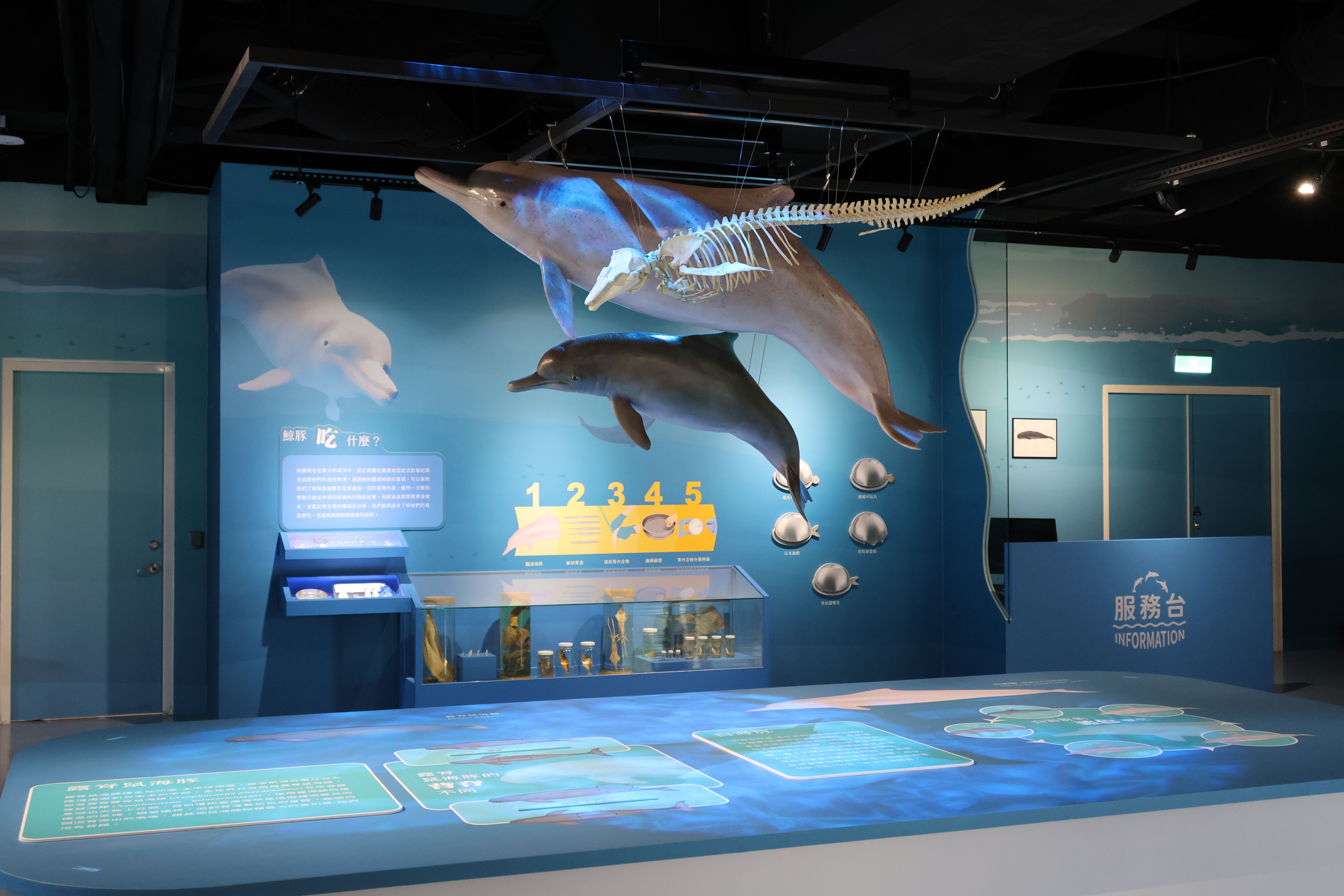 (3)淺海食物網中的高階消費者:以露脊鼠海豚骨骼標本與白海豚成、幼體模型為核心展示,並藉此說明兩類鯨豚在生態中的角色,強調重要棲地之環境保育意義。