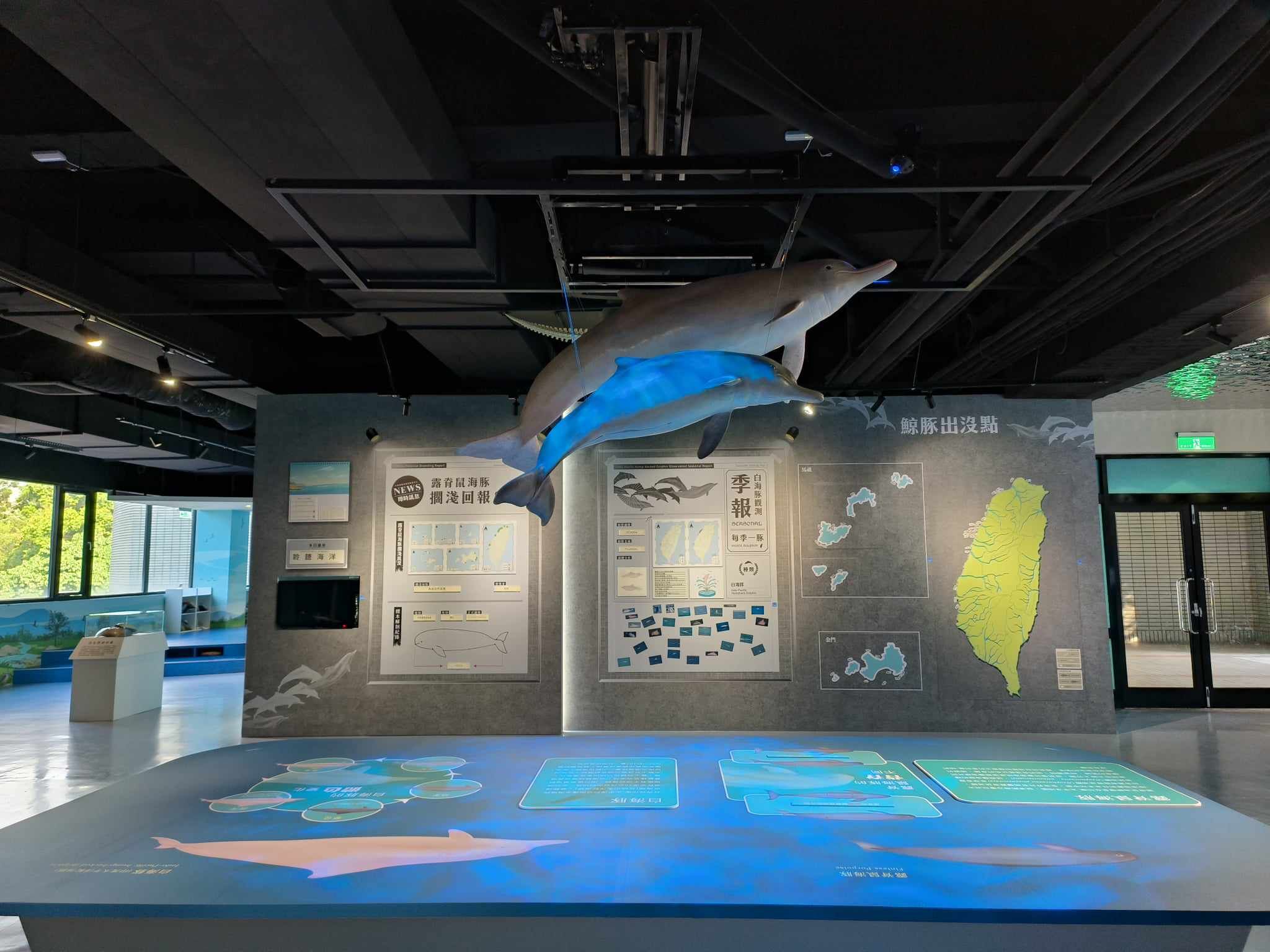 (1)白海豚迎賓池:以三隻長期追蹤調查的白海豚個體作為主要展示對象,配合魚類食餌模型,打造海洋氛圍的迎賓池。於二樓可平視白海豚模型,提供個體辨識課程教學使用。